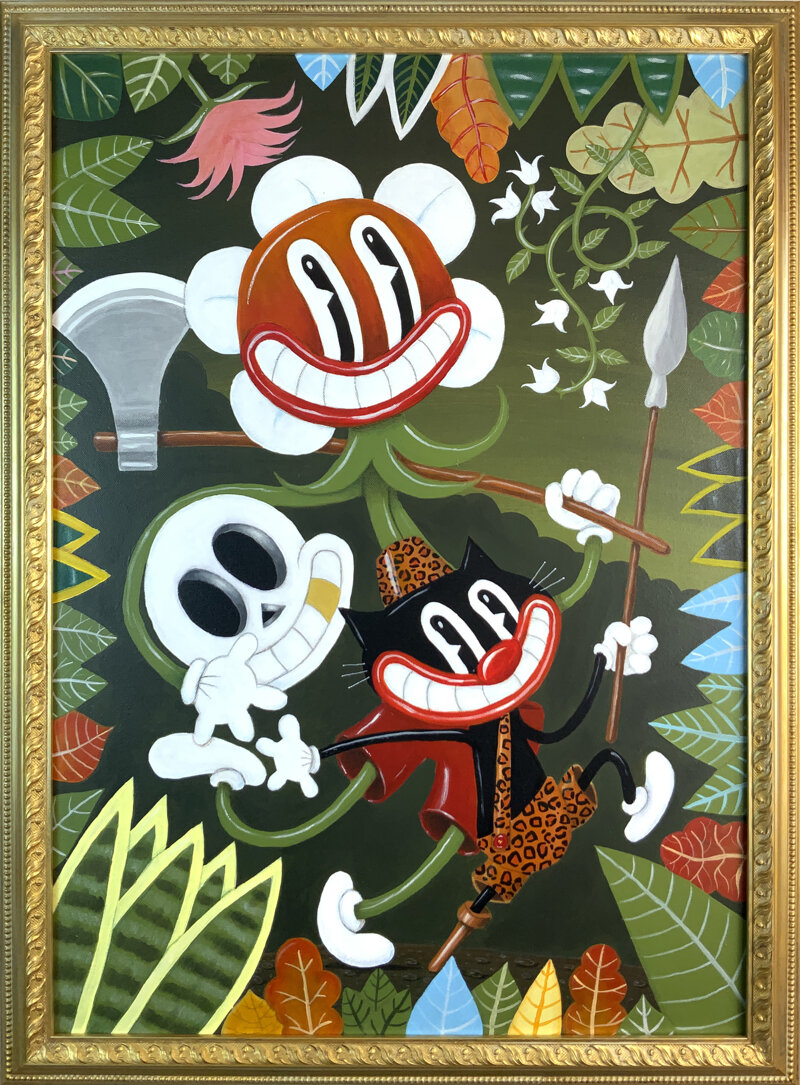 JUNGLE FEVER (FINDING ROUSSEAU) fa parte di "Le Moschine", una serie di dipinti acrilici nello stile dei vecchi cartoni animati americani degli anni '20 e '30.