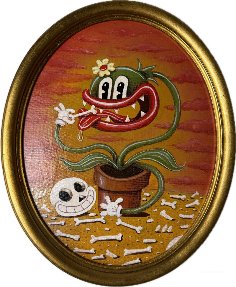 FLO, la Pianta Carnivora, fa parte de “Le Moschine”, una serie di dipinti a colori acrilici e pastelli su tela e legno, ispirati allo stile dei cartoon americani degli anni venti e trenta del ‘900.